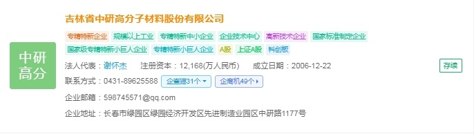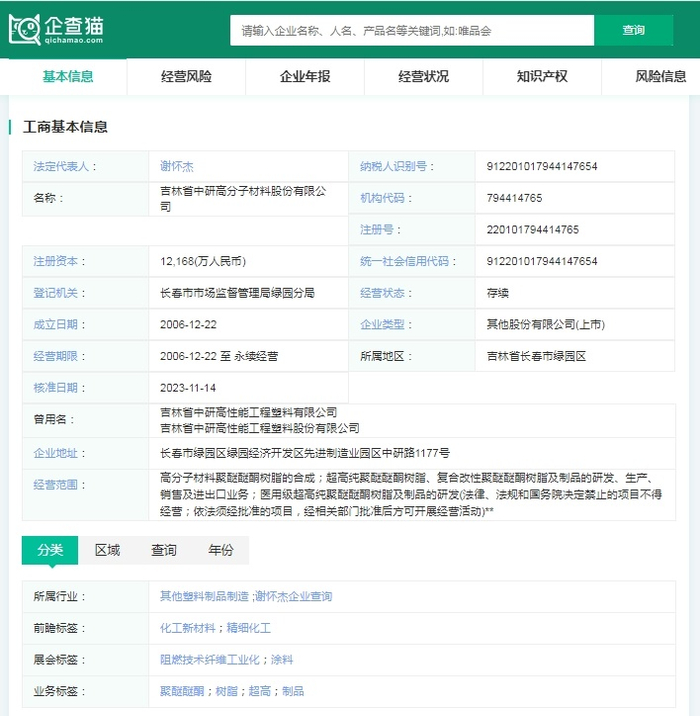 企查猫资料显示,吉林省中研高分子材料股份有限公司(简称:中研股份)成立于2006年,法人代表是谢怀杰,注册资金为12,168(万人民币)。