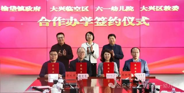 北京市六一幼儿院院长曹雪梅与大兴区教委主任赵建国、榆垡镇镇长施艳青、临空区管委会发改部部长李志广签署合作办学协议