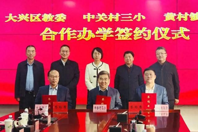 中关村第三小学教育集团校长杨刚与大兴区教委主任赵建国、黄村镇镇长陈杰签署合作办学协议