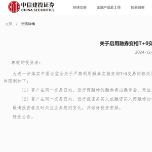 【环球网财经综合报道】12月19日,中信建投于官网发布《关于启用融券变相T+0交易限制功能的公告》(下称《公告》)。《公告》提到,为进一步落实中国证监会关于严禁利用融券实施变相T+0交易的相关要求,中信建投拟于12月27日启用融券变相T+0交易限制功能。