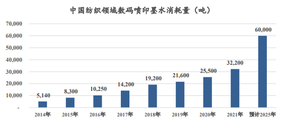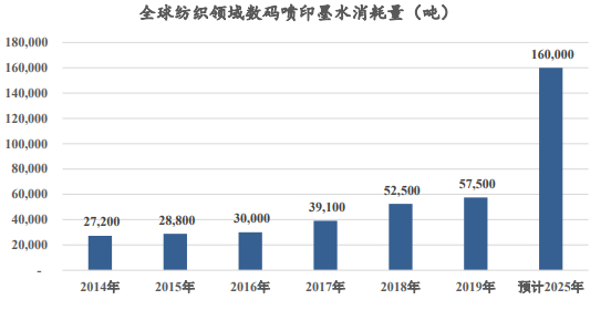 根据中国印染行业协会统计, 2014-2019 年,全球纺织领域数码喷印墨水消耗量由2.72万吨增至5.75万吨,复合增速为16.15%,预计到2025年全球纺织领域数码喷印墨水消耗量将达到16万吨,6年复合增速为18.60%。