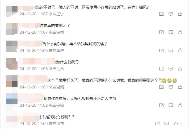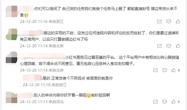 其中有用户表示不解,且账号被封申诉困难。“你们自己发的任务,我们做个任务就直接封号,擦边的买号的却不封”、“小红书投诉电话形同虚设,打投诉电话回复以审核反馈为准”、“申诉内容好歹看一眼呢,就秒驳回啊?”。