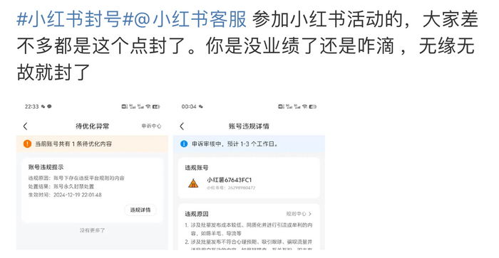 小红书大面积封号登顶微博热搜,有用户称参加个平台活动就被封