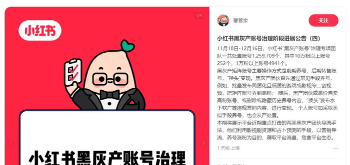 值得注意的是,小红书官方账号“薯管家”此前曾发布黑灰产账号治理阶段进展公告,称11月18日-12月16日,小红书一共处置账号1259709个,其中10万粉以上账号252个,1万粉以上账号4941个。