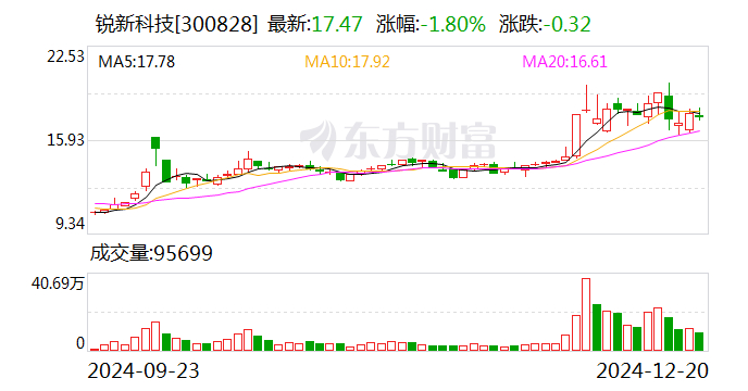锐新科技(300828.SZ)12月20日在投资者互动平台表示,尊敬的投资者您好。公司及子公司产品主要应用于工业自动化技术及医疗器械领域、汽车轻量化及新能源汽车领域、清洁能源领域。公司将结合自身实际情况,积极拓展符合公司发展规划的业务。感谢您的关注!