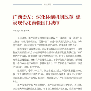 崇左市委书记蓝晓介绍,崇左市坚持以经济体制改革为牵引,因地制宜发展新质生产力,持续推进战略性新兴产业集群发展,加快打造“411”特色产业体系,即铜锰稀土新材料及循环经济、化工及新能源电池材料、高端家居及造纸、糖和农产品及食品加工4个千亿级产业集群,新型建材1个500亿级产业集群,装备制造1个200亿级特色产业集群,推动产业向新、向绿、向智发展。