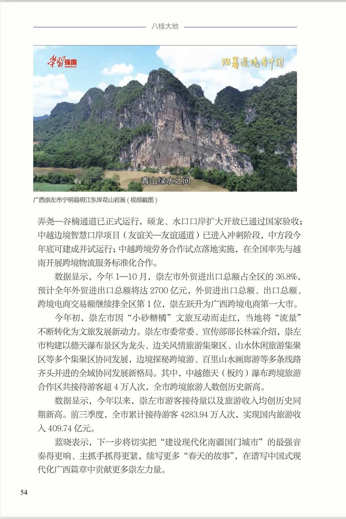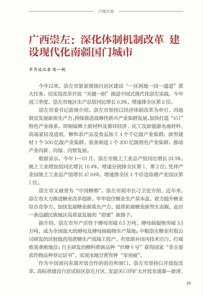 据介绍,崇左市年产活性干酵母突破6.5万吨、酵母抽提物突破3.5万吨,成为全国最大的酵母及酵母抽提物生产基地;中粮崇左糖业有限公司研发的注射级药用蔗糖生产线竣工投产,有效填补国内技术空白,打破欧美垄断地位;自主研发的糖料蔗新品种“壮糖6号”获得国家“非主要农作物品种登记证书”,实现本地甘蔗育种“零突破”作为中国面向东盟开放合作的前沿和窗口,崇左市坚持以开放促改革,高标准建设自贸试验区崇左片区,友谊关口岸扩大开放至浦寨—新清、弄尧—谷楠通道已正式运行,硕龙、水口口岸扩大开放已通过国家验收;中越边境智慧口岸项目(友谊关—友谊通道)已进入冲刺阶段,中方段今年底可建成并试运行;中越跨境劳务合作试点落地实施,在全国率先与越南开展跨境物流服务标准化合作。