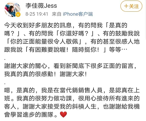 后来,李佳薇回应做中介卖房子一事,她坦诚自己的确是在当代销销售人员,并且是很认真的在上班。李佳薇称,自己为了做好中介工作,做了很多功课,用心接待每一位客人。但她也强调,自己没有放弃唱歌,还是很爱舞台的,唱歌依旧是自己的第一志愿。