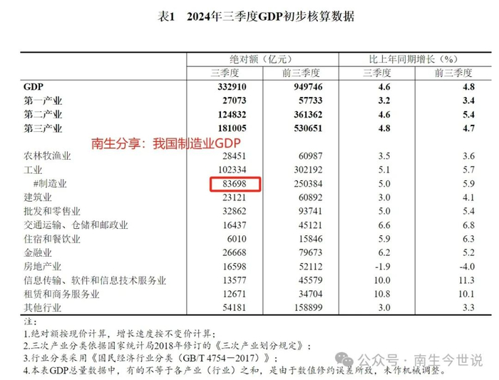 以中国国家统计局公开的数据为准,今年第三季度的GDP总规模为332910亿元人民币,制造业创造的行业GDP为83698亿元人民币(如下图),占比25.14%,远超美国。