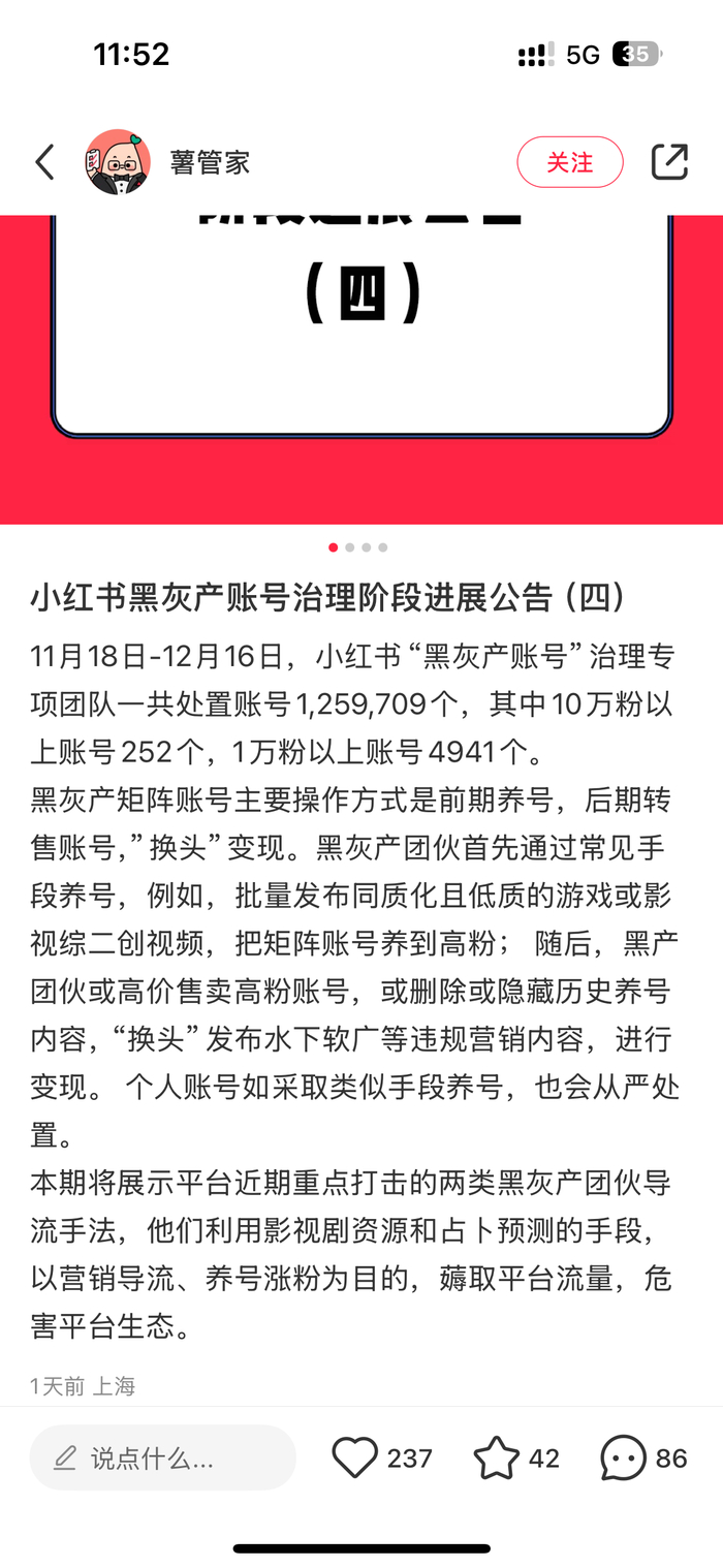 最新的治理进展是,小红书官方账号“薯管家”曾发布黑灰产账号治理阶段进展公告(四)。公告称,11月18日-12月16日,小红书一共处置账号1259709个,其中10万粉以上账号252个,1万粉以上账号4941个。