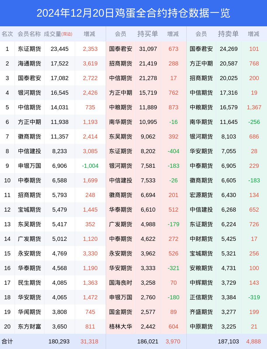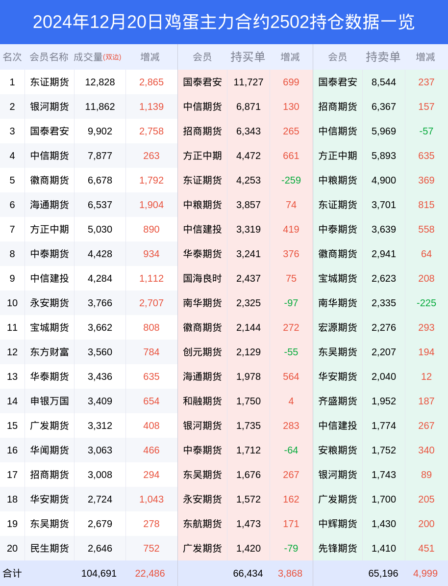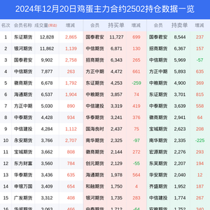 新浪期货 根据交易所数据,截至12月20日收盘主力合约鸡蛋2502,涨跌+1.17%,成交量9.05万手,持仓数据显示前20席位呈现净多,差额头寸为1238手。