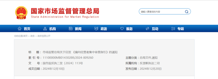 《横向经营者集中审查指引》已经2024年12月2日市场监管总局第29次局务会议通过,现印发给你们,请结合实际做好宣传和贯彻实施。