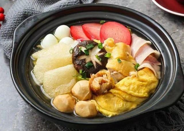 临近新年,仙霞社区长者食堂(虹古店)还推出了全家福砂锅,包含大白菜、香菇、香肠、蛋饺、牛肉丸、鹌鹑蛋和肉皮等多种食材,每种食材都有其独特的象征意义。例如,蛋饺形状像元宝,象征着财富和好运;肉皮色泽金黄,口感松软,寓意着美满、团圆和幸福。