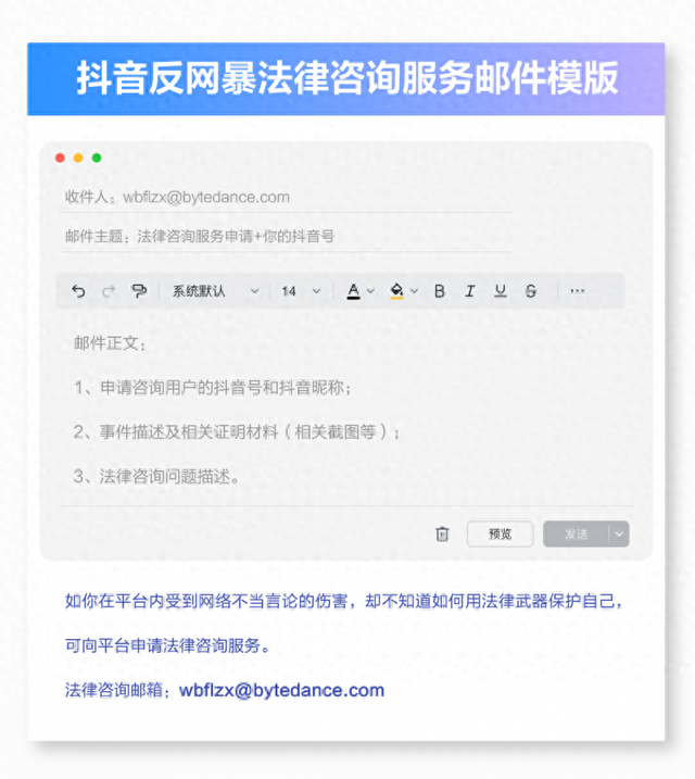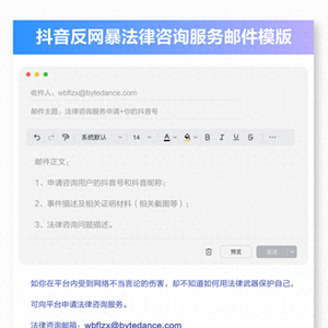 2023年12月18日,抖音与中国法律咨询中心合作,正式推出反网暴法律咨询服务,为疑似遭受网暴的用户提供法律咨询服务。2024年12月20日,抖音与中国法律咨询中心联合发布《反网暴法律咨询服务报告》(下文简称《报告》),向网友们分析相关案例的法律责任,并给出了如何维权的具体建议。