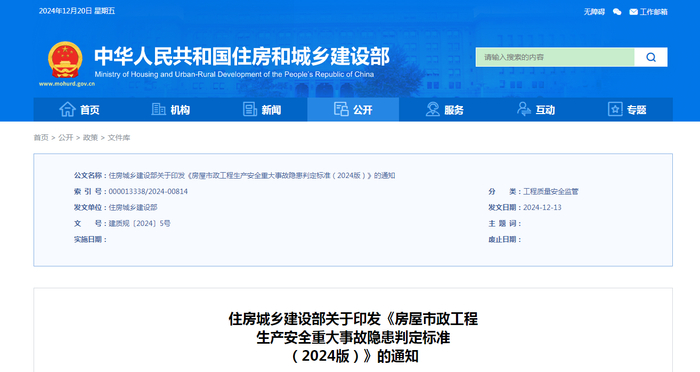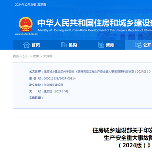 近日,住房城乡建设部印发《房屋市政工程生产安全重大事故隐患判定标准(2024版)》(以下简称《标准》)。
