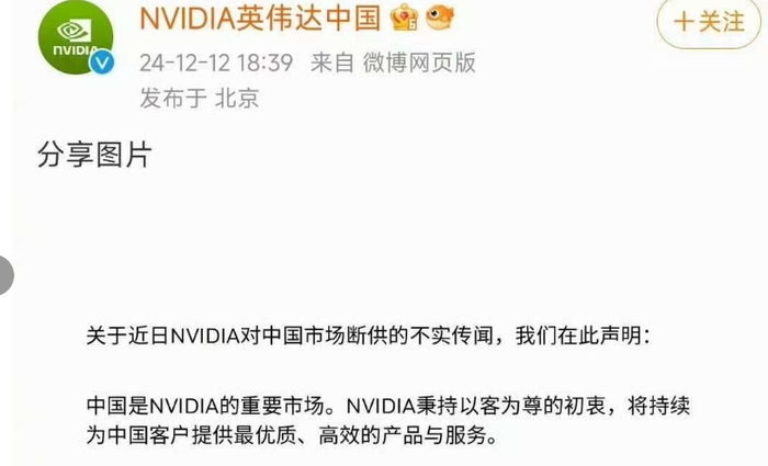 到了12月12日晚上,英伟达官微紧急发布声明称,关于近日NVIDIA对中国市场断供的不实传闻。
