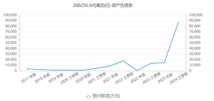 2024年第三季度,寒武纪的存货约为10.15亿元人民币,亮点在于第三季度的预付款项达到了8.54亿元人民币,这部分主要为晶圆预付款成本。