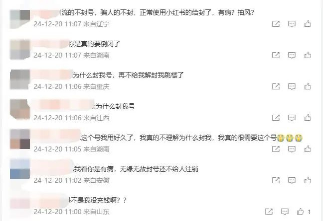 其中有用户表示不解,且账号被封申诉困难。“你们自己发的任务,我们做个任务就直接封号,擦边的买号的却不封”、“小红书投诉电话形同虚设,打投诉电话回复以审核反馈为准”、“申诉内容好歹看一眼呢,就秒驳回啊?”。