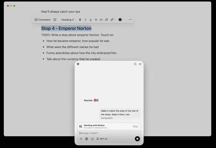 有了这个新功能,ChatGPT得以与Notion无缝协作。现场演示聚焦于文档中的特定文本段落,并设定任务为“补充这些对话要点”。此外,用户还可利用ChatGPT的搜索功能来生成回应。例如,在演示中,它根据所选文本生成了关于“诺顿皇帝(诺顿一世)”的对话要点,并附上引用及来源。