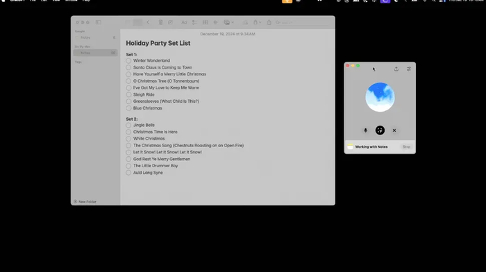 第三,除了文本选择、复制粘贴的传统操作外,MacOS桌面应用支持高级语音模式,同时能与其他应用程序协同工作。在此模式下,用户可在Apple Notes中设定“节日派对歌单”,并通过ChatGPT征询圣诞老人对候选歌曲的意见。ChatGPT甚至能指出用户的错误,如将圣诞歌曲《Frosty the Snowman》误写为《Freezy the Snowman》。