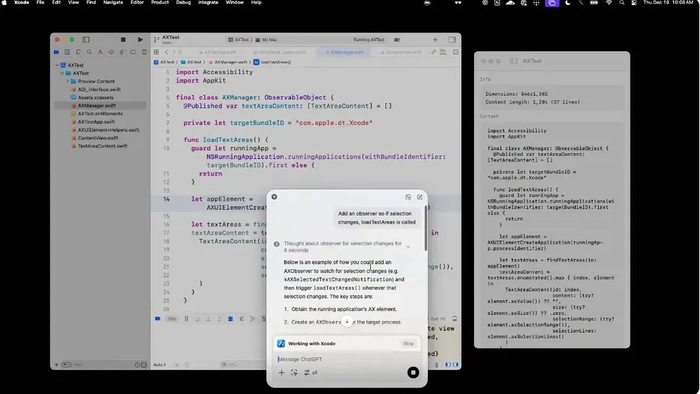 与Windows Recall功能相比,ChatGPT更注重与应用程序的实时协同工作,而非仅仅记录和构建回忆库。在另一场演示中,OpenAI团队将ChatGPT与XCode紧密结合,使得它可以在苹果的开发应用程序中工作。用户只需简单提出请求,ChatGPT便能生成代码或解决编程难题。