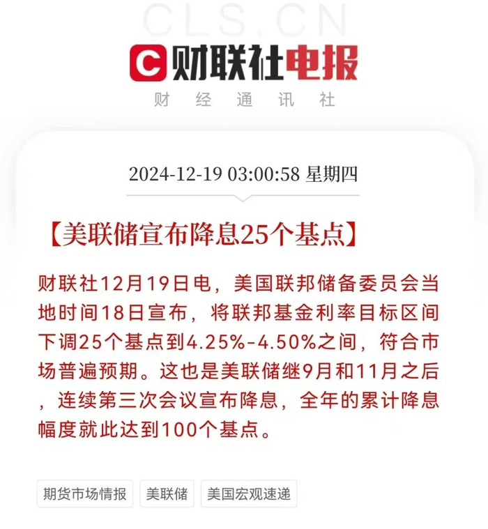 北京时间12月19日凌晨3点,美联储宣布降息25个基点,将联邦基金利率目标区间下调到4.25%-4.50%之间!