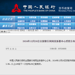 2024年12月20日贷款市场报价利率(LPR)为:1年期LPR为3.1%,5年期以上LPR为3.6%。
