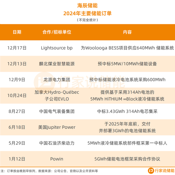据公开资料显示,海辰储能2024年前三季度全球储能电池出货量累计超40GWh。另据行家说储能不完全统计,海辰储能2024年公开的储能订单超12.68GWh。