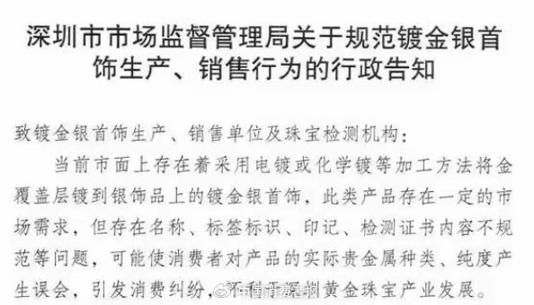今年10月23日,广东省深圳市市场监管局发布《关于规范镀金银首饰生产、销售行为的行政告知》,对镀金银首饰的名称、标签标识、印记、检测证书等提出了明确要求。