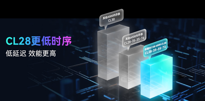 DW100 时空行者 6000MT/s CL28、DX100 月光宝盒 6000MT/s CL28、HX100 斗战行者 6400MT/s CL30均配置超低时序,比6000、6400同频率内存时序更低,CL28-35-35-72、CL30-37-37-76更是市售6000 C28、6400 C30内存中的综合时序顶配。游戏1%Low帧显著提升,助力玩家在关键时刻锁定胜局!