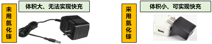 氮化镓在生活中主要应用于各种快充头,开关频率高、损耗低、体积小,适合做电源芯片。
