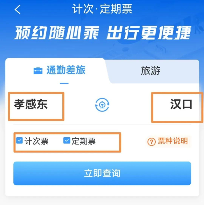 填写购买产品的发到站名称:“孝感东”和“汉口”,勾选“计次票”“定期票”后,点击“立即查询”。