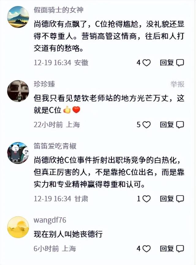 也有网友评论到:尚德欣有点飘了,C位抢得尴尬,没礼貌还显得不尊重人。营销高管这情商,往后和人打交道有的愁了。