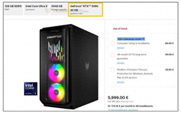 近日,德国知名零售商Otto.de意外地上架了两款搭载全新NVIDIA GeForce RTX 50系列显卡的台式机,尽管这两款产品很快被撤下,但幸运的是,VideoCardz及时捕捉到了这一瞬间,并截图保存了相关的配置和价格信息,使得公众得以一窥这两款高端游戏PC的概貌。