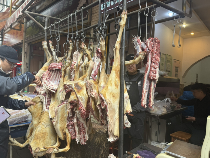 位于篆新农贸市场内的一家羊肉餐馆,顾客络绎不绝,既有前来享用羊肉汤的食客,也有购买生羊肉的顾客。该餐馆的羊肉按部位分类销售,生羊肉前腿138元/公斤,后腿168元/公斤,纯里脊200元/公斤。二楼还提供羊肉火锅,精品熟羊肉的价格为238元/公斤,羊杂230元/公斤。此外,店内还出售多种羊肉制品,如净羊肠、羊肚、手抓羊排、黄焖羊肉等。工作人员张先生表示:“冬季是羊肉的销售旺季,目前店内每天能售出六七只整羊,每只羊重约27公斤。相比淡季时每天售出的三四只羊,销售量出现明显增长。”