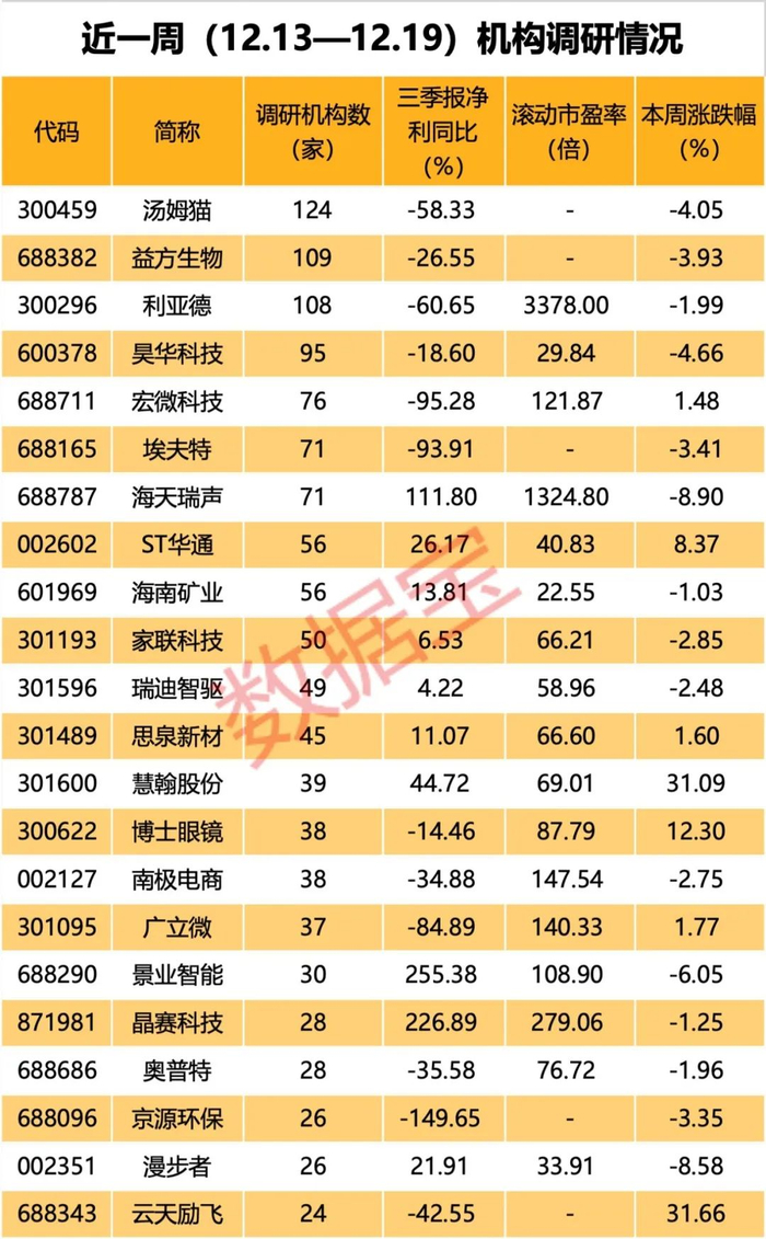 近一周机构调研个股数量有近200只,汤姆猫成为调研机构数量最多的股票。