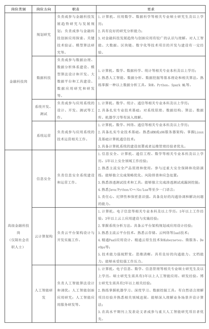 7.年龄一般在35岁以下(1990年1月1日以后出生),博士学历及高级金融科技岗可放宽至40岁以下(1985年1月1日以后出生)。