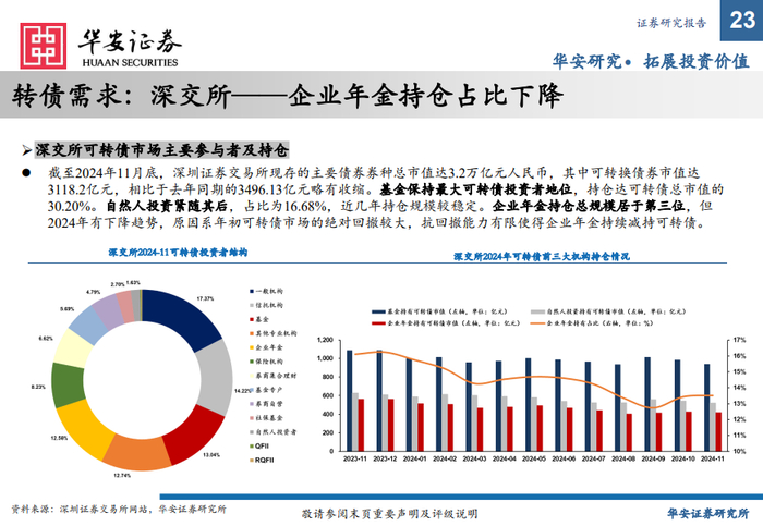⚫ 转债市场的供需情况——供给端持续收缩,需求结构进一步发生变动。转债新发规模持续下降,截至2024年11月,转债发行38只,较去年同期120只大量减少。2025年净供给或进一步收缩。从行业结构看,供给端行业多元化,发行规模均有所收缩。市值发行情况,中小盘成为主导,发行主体质量持续优化。退市规模与数量自2019年保持平稳波动,预计平均存续期将持续增长。转债需求当中基金仍保持最大投资者地位,但需求结构发生明显变化。深交所中企业年金持仓占比下降,上交所中保险机构持仓占比抬升。