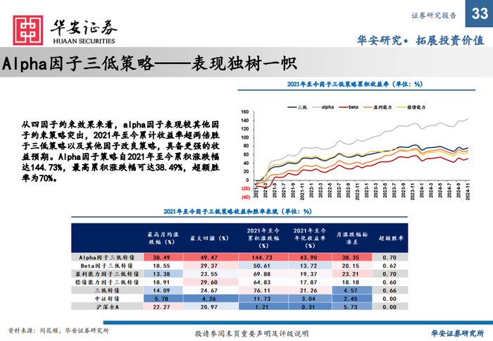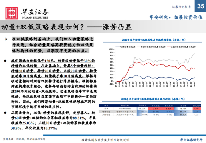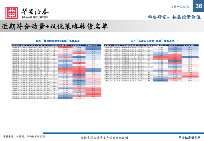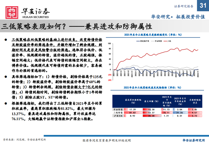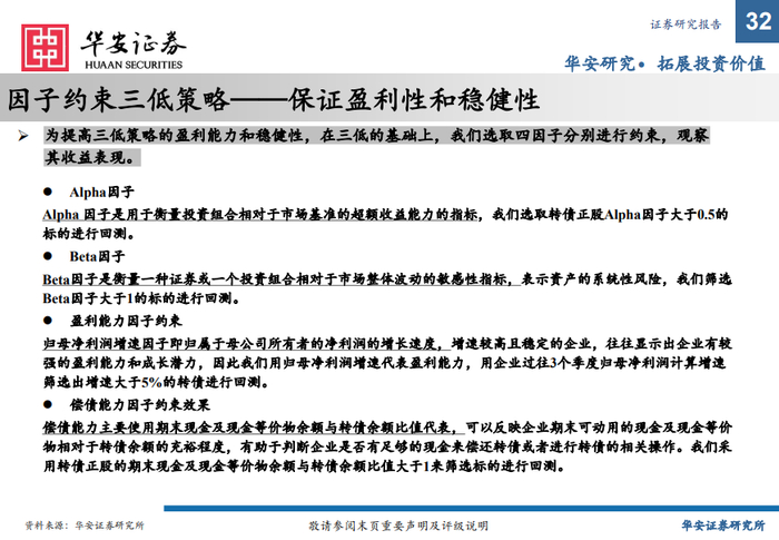 ⚫ 转债策略适用性——双低策略将大显身手,Alpha因子三低策略独树一帜。截至11月底,中证转债指数上涨2.43%,同花顺沪深全A指数上涨1.30%,横向对比中证转债指数存在补涨空间,趋势呈现逆势底部反转,转债市场有望突破震荡走势。短期来看,目前转债估值处于低位,债市将保持良好发展趋势,此时采取双低策略或将有利可图。长期来看,债市发展稳中向好,正股进行现金分红福利将促使转股价的下调,可转债价值增加,采取改良高股息策略可突出重围。历史回测结果看,Alpha因子三低策略始终保持超高的收益能力,在转债市场波动上行明显的背景下,Alpha因子三低策略不失为一种较好选择。
