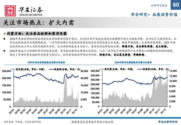 促销费、扩内需政策利好下的家电、食品饮料板块。2024年食品饮料板块虽出现较大波动但整体仍居于高位。12月9日的中央政治局会议强调明年要大力提振消费、全方位扩大国内需求。而食品饮料板块作为顺周期板块,一系列促销费扩内需的利好政策的出台有望改善行业发展,提振市场情绪。从宏观环境判断,2025年食品饮料板块上市公司的环境较为有利,企业面临的成本压力较小,看好食品饮料板块走势。