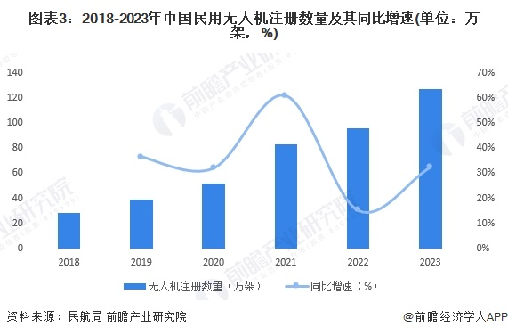 随着我国人均消费水平以及无人机技术水平的提高,公众对智能生活的需求增大,带动民用无人机行业发展,注册数量快速增长。根据中国民用航空局公布的数据,2023年,全国民用无人机注册数量达126.7万架,同比增长32.25%。