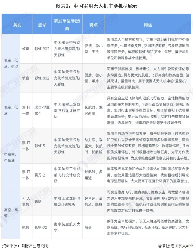 当前,我国军用无人机进入加速发展阶段在总体设计、飞行控制、组合导航、中继数据链路系统、传感器技术、图像传输、信息对抗与反对抗、发射回收、生产制造和部队使用等诸多技术领域积累了一定的经验,具备一定的技术基础。我国军用无人机部分代表机型如下: