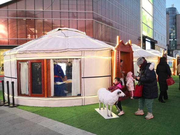 冬至是吃羊肉的时令。12月20日,在北京市王府井步行街,身着盛装的乌兰牧骑演员在这里表演,游客和市民们纷纷品尝当地的美食,并拍照打卡。这是内蒙古锡林郭勒盟东乌珠穆沁旗在京推介地方特色品牌——乌珠穆沁羊。