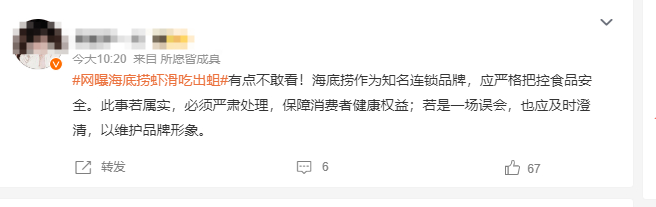 也有网友称,海底捞作为知名连锁品牌,应严格把控食品安全。此事若属实,必须严肃处理,保障消费者健康权益;若是一场误会,也应及时澄清,以维护品牌形象。