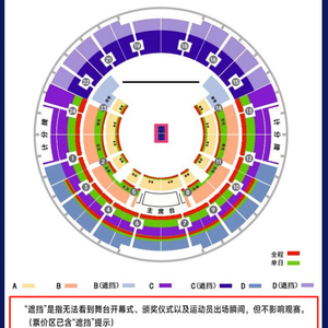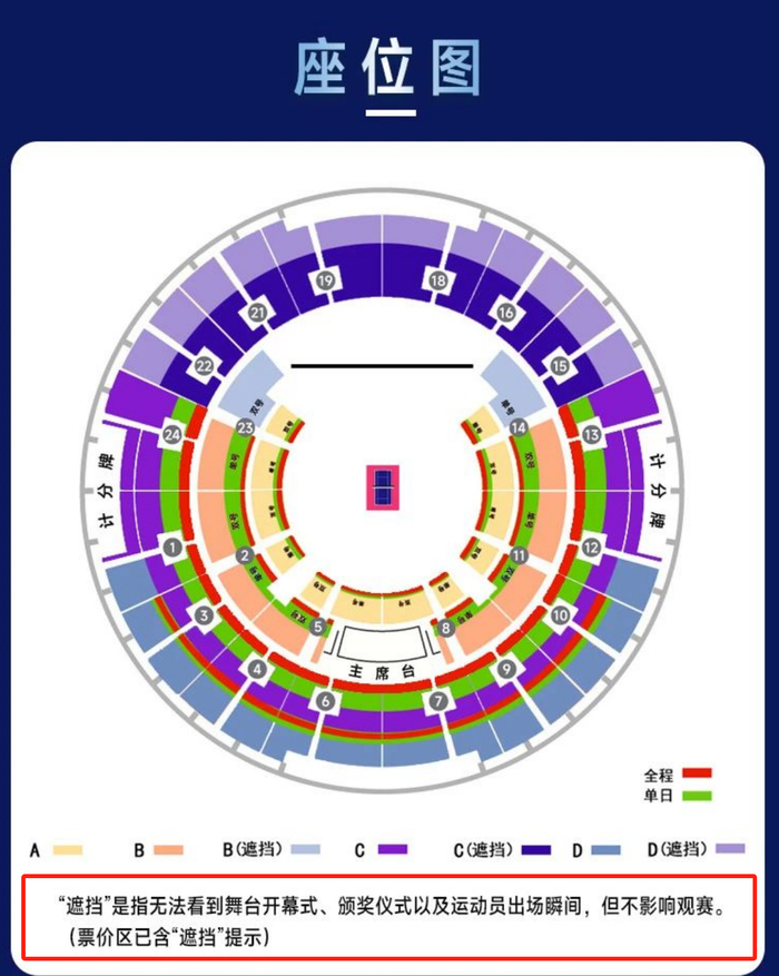 值得一提的是,在公布具体票价的同时,比赛的具体赛程也一并公布,同时座位图还特意标注出了遮挡位置,即无法看到舞台开幕式、颁奖仪式以及运动员出场瞬间,但不影响观赛的位置。
