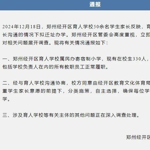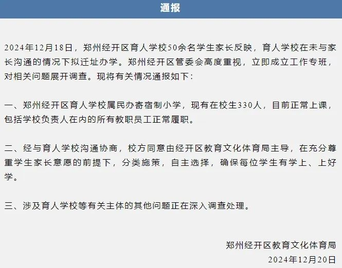 2024年12月18日,郑州经开区育人学校50余名学生家长反映,育人学校在未与家长沟通的情况下拟迁址办学。郑州经开区管委会高度重视,立即成立工作专班,对相关问题展开调查。现将有关情况通报如下: