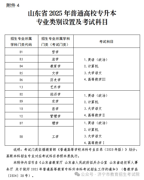 4.山东省2025年普通高校专升本专业类别设置及考试科目