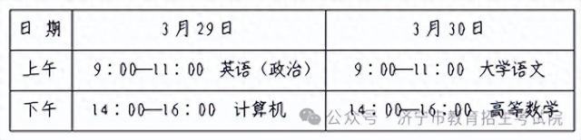 统考科目为4门公共基础课,包括英语(专科期间公共外语课程为非英语的考政治)、计算机、大学语文、高等数学(分为高等数学Ⅰ、高等数学Ⅱ、高等数学Ⅲ),具体考试科目设置情况见附件4。每门科目考试时间120分钟、满分100分,总分满分400分。省教育招生考试院负责统一命题,统一考试,统一评卷。各科考试时间安排如下: