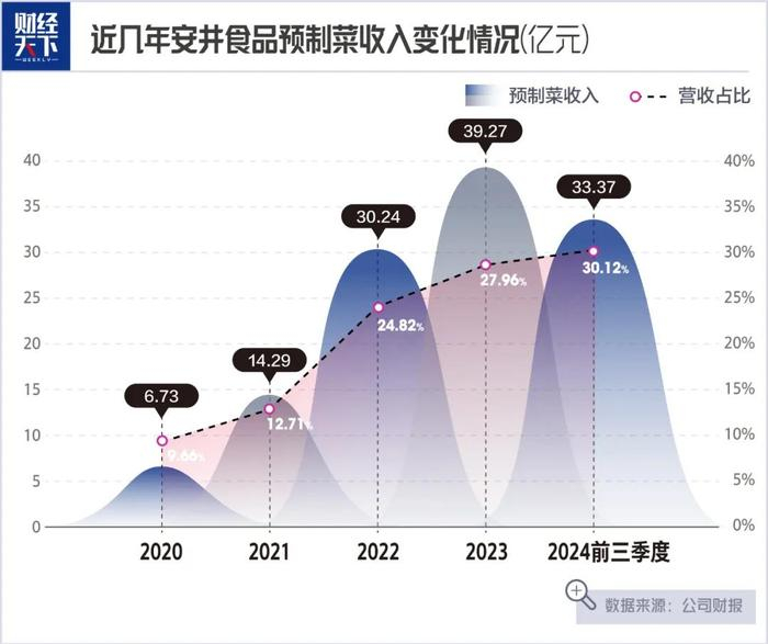但《财经天下》发现,安井食品上市后迎来的2020年至2022年快速增长期,也恰恰是公司预制菜突飞猛进的年头,该板块营收增速一度高达112%,2024年前三季度增速只有7.34%,而此时预制菜收入占比已达到30.12%,明显的降幅自然也就拖了公司的后腿。