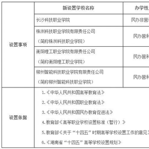 日前,湖南省教育厅发布高等学校设置事项公示。根据《湖南省“十四五”高等学校设置规划》,经省第四届高等学校设置评议委员会专家组现场考察、集体评议,现将新设置长沙科技职业学院、株洲科技职业学院有限责任公司、衡阳理工职业学院有限责任公司、郴州智能科技职业学院有限责任公司予以公示。公示时间为2024年12月19日至2024年12月25日。